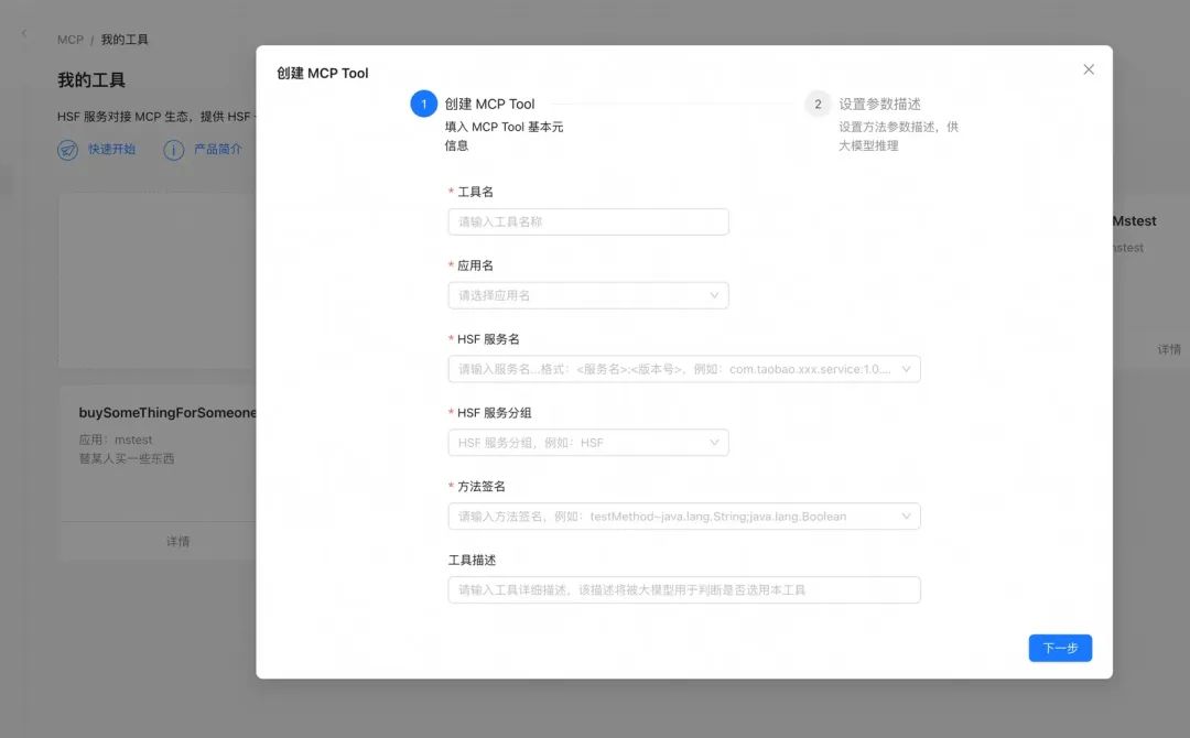 step2:选择需要转 MCP Tool 的 hsf 应用(自己为 owner/ops 的应用)、服务名和方法名。 注意:工具描述需要准确具体,用于给大模型识别 tool 的用途。