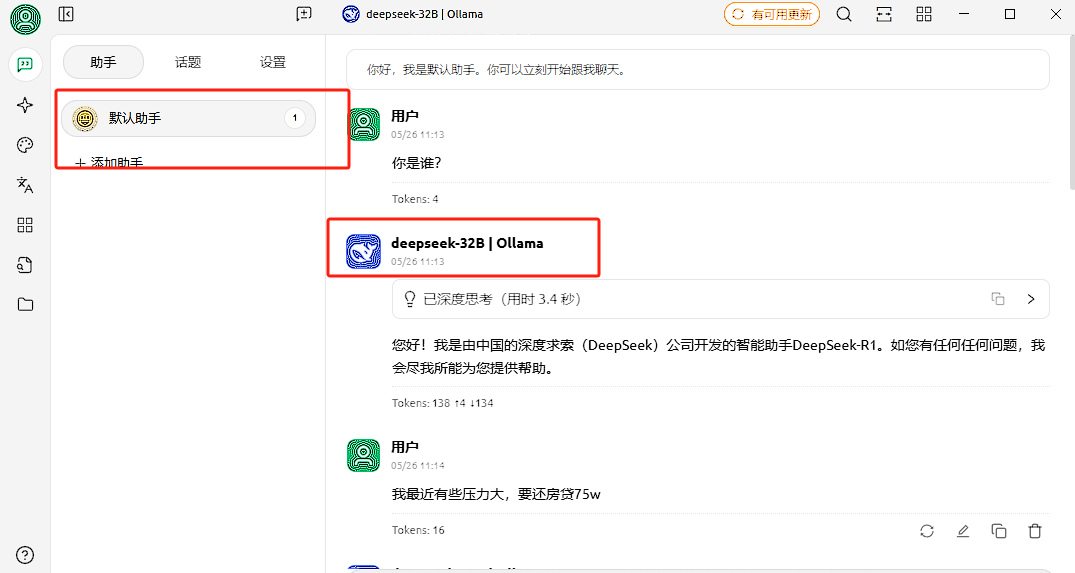 最后在默认模型->默认助手模型,选择自己部署的本地模型ollama。虽然我们在本地部署是基于vllm,但是对于ollama与vllm等中间件提供推理服务时,都是会支持openai api格式的API服务提供的。
