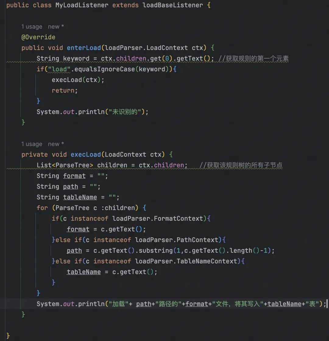 publicstaticvoidmain(String[]args){StringoriStr="loadjson.`F:\\tmp\\temp.json`astemp;";ANTLRInputStreaminput=newANTLRInputStream(oriStr);loadLexerlexer=newloadLexer(input);CommonTokenStreamtokens=newCommonTokenStream(lexer);loadParserparser=newloadParser(tokens);loadParser.LoadContexttree=parser.load();MyLoadListenerlistener=newMyLoadListener()arseTreeWalker.DEFAULT.walk(listener,tree);}