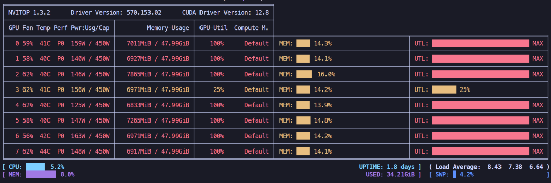 再用八卡运行,开启DeepSpeed stage 3,显存占用76.88GB。