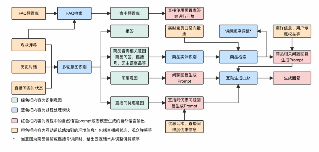 • 讲解顺序调整:如果意图为商品讲解或者链接号讲解,将不会使用LLM生成回复,而是调整讲解顺序,使用固定话术进行回复。