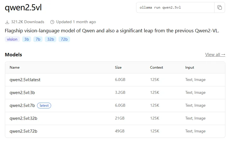 运行命令:ollama pull qwen2.5vl:7b,下载 qwen2.5vl (7b 规格)到本地。