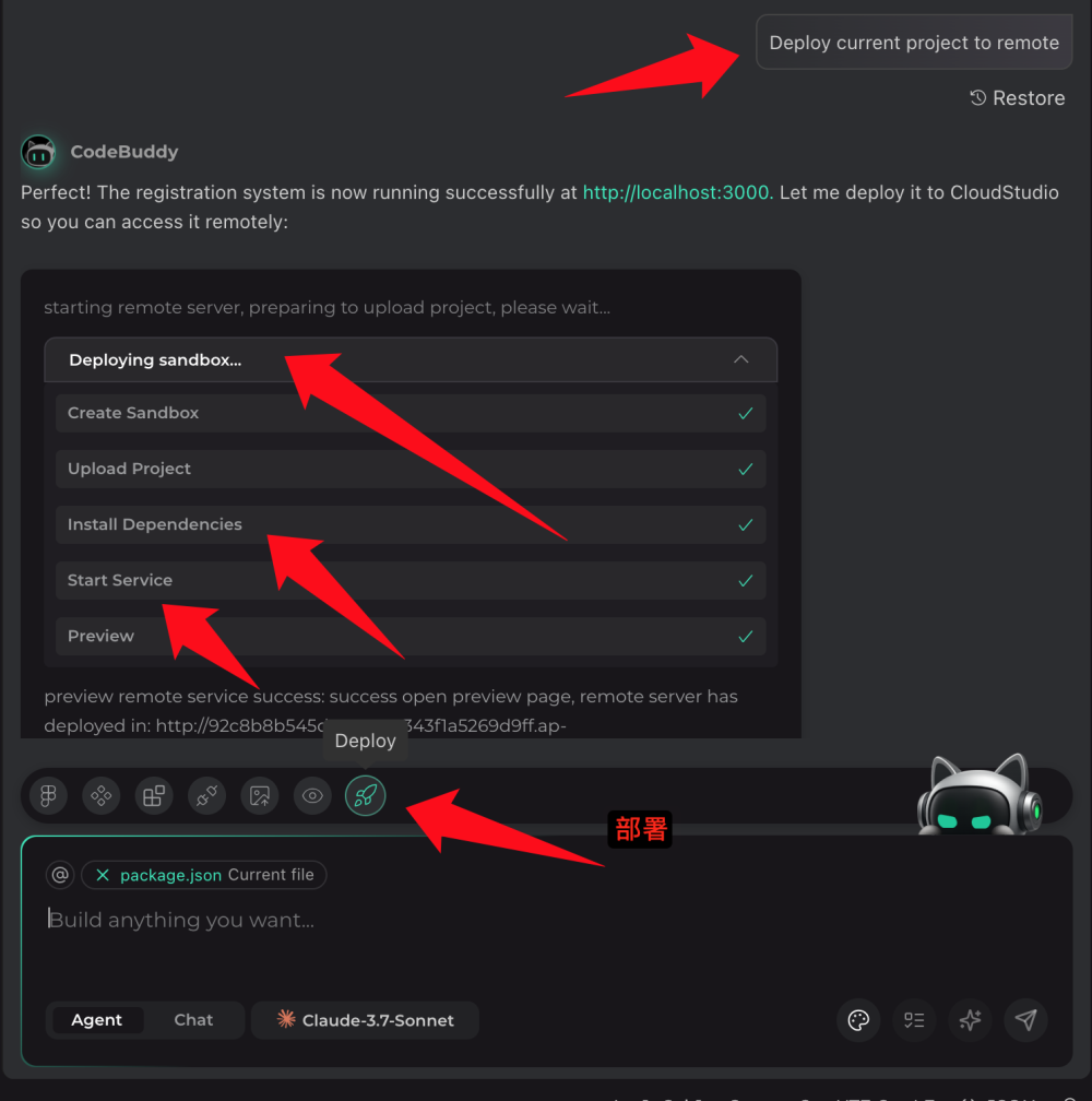 最后,进入本地测试,如果没有问题,点击部署按钮,自动配置,帮你部署到远端 CloudStudio 当中。