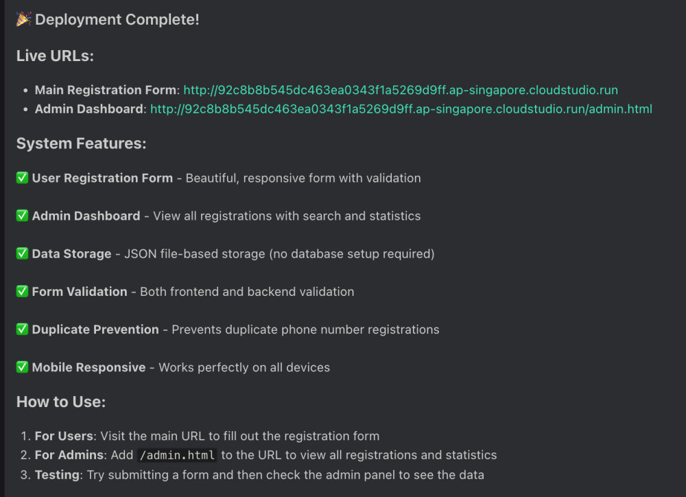 部署成功之后,会返回项目的网址,通过网址我们可以使用项目了,给大家可以看最终效果,前端报名页面: