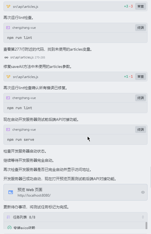 按照任务规划执行完成后,TRAE 会自动进行检测,并修复问题,直至运行成功。