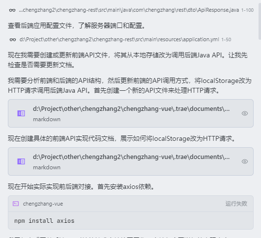 我第一次尝试是在生成后端代码的对话中执行的上述指令,TRAE 直接进行开发生成,结果不是太好。