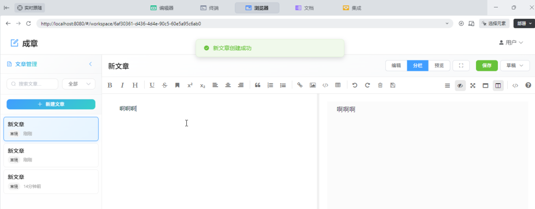 TRAE 自动在内置浏览器中实现预览,简单新增一篇文章测试下。