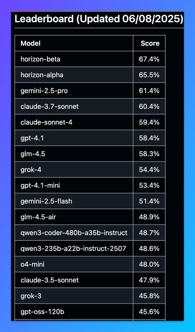 • Horizon Alpha:256K tokens 上下文,生成速度极快,约 130–150 tokens/秒,在创意写作和 EQ‑Bench 情感理解任务中登顶。