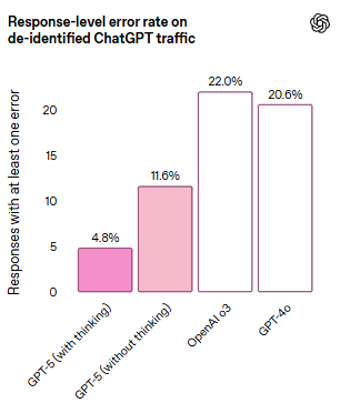 3大幅减少“幻觉”现象:语言模型过去常因生成不准确或虚构的信息而受到诟病。GPT-5 在这方面取得了显著进步,其“幻觉”现象大大减少。在复杂开放式问题上,它的幻觉率比 OpenAI o3 低约六倍。这意味着您可以更放心地依赖它来处理重要任务。