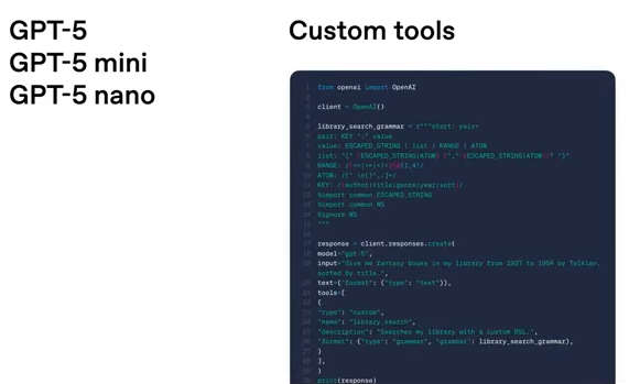 3)自定义工具(Custom Tools):允许以纯文本而非JSON格式调用工具,并支持通过上下文无关语法进行约束。