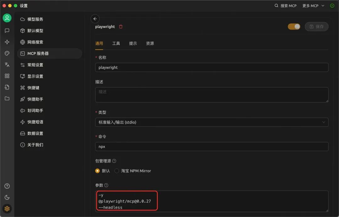 1.在设置--MCP服务器中,添加一个服务器,类型选择「stdio」,命令输入「npx」,写入参数如图。-y 可以让agent自动进行工具调用而无需等待用户同意;@playwright/mcp@0.0.27 指定安装的工具及版本,也可以指定@playwright/mcp@latest;--headless开启无头模式,agent的浏览器操作不会打开一个可见的浏览器,如果想要看浏览器的调用过程就移除这个参数。