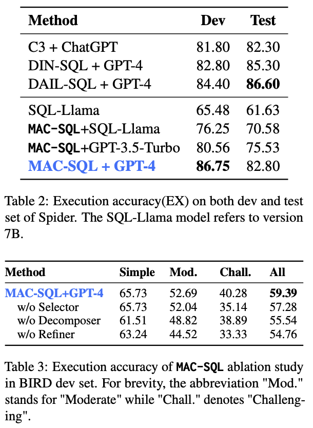 基于开源BIRD和Spider数据集,本框架配合自研的7B模型,执行准确率超过ChatGPT-3.5等。本框架的方法配合 GPT-4 使用,能够达到SOTA的水平,远超单独直接使用GPT-4的效果。