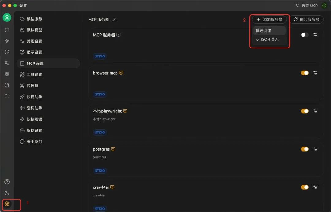 6.回到设置,选择“MCP设置”,点击添加服务器--快速创建。(若需要安装依赖,跟着客户端教程无脑安装即可)