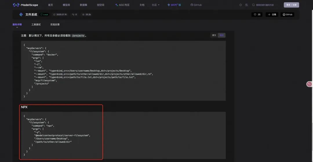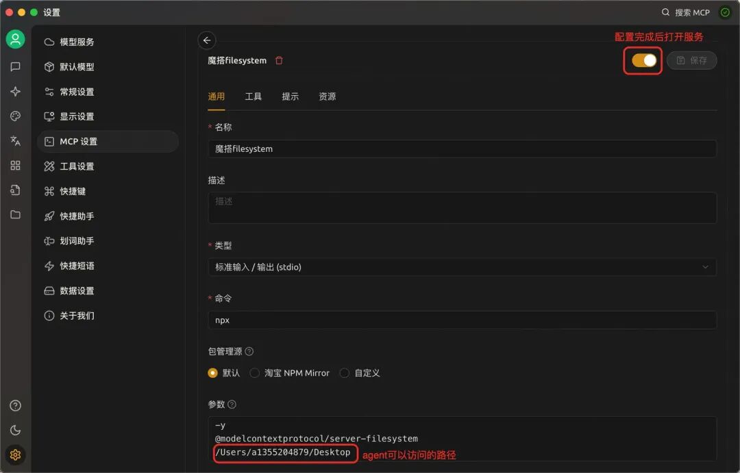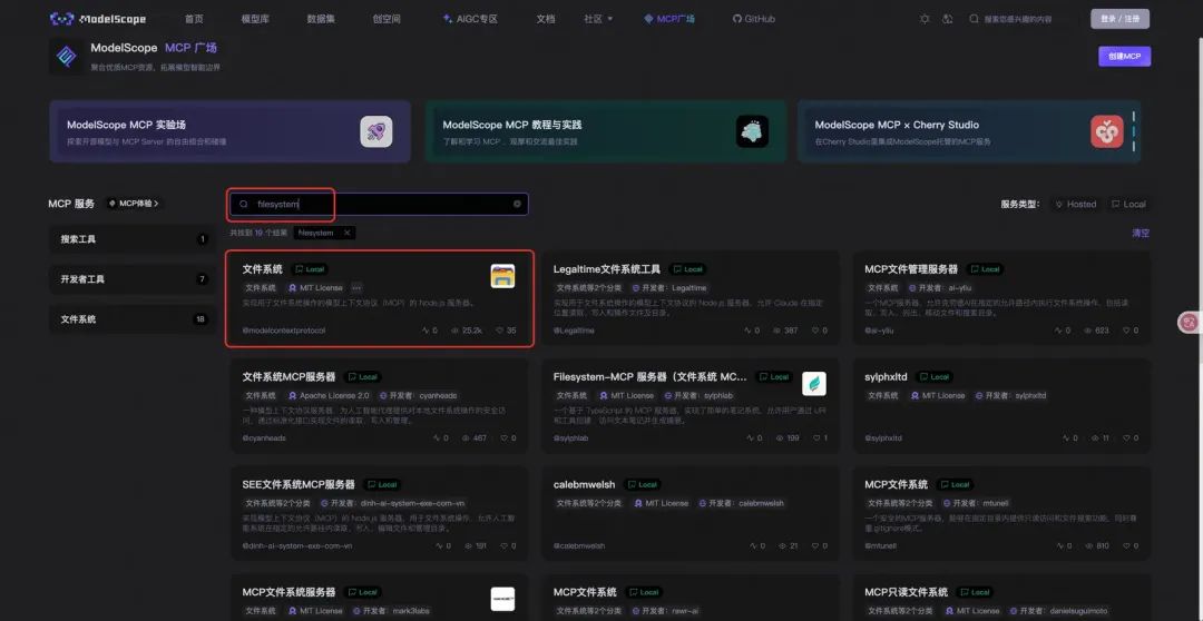 7.配置MCP Server。这里以魔搭社区提供的文件系统服务为例。
