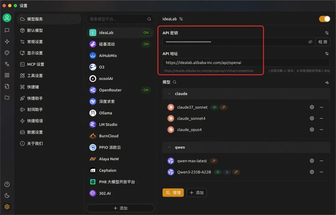3.添加完成后,输入ideaLab的sk,填入API地址。