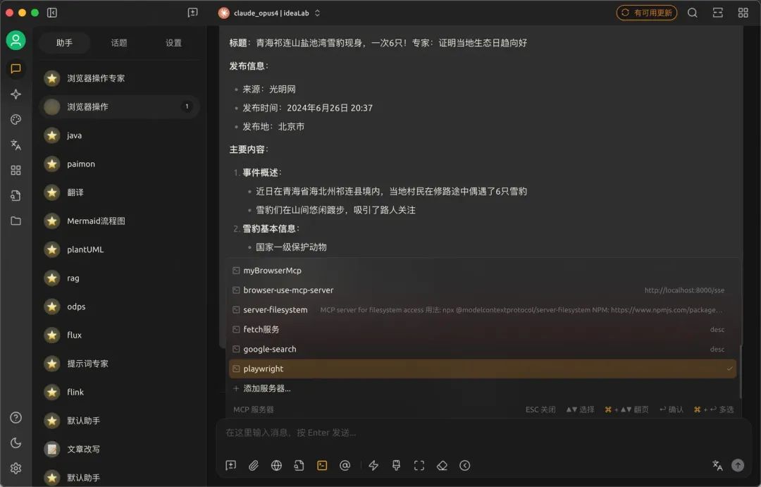 2.回到聊天助手页面,打开MCP服务器,选择刚才配置好的MCP Server。