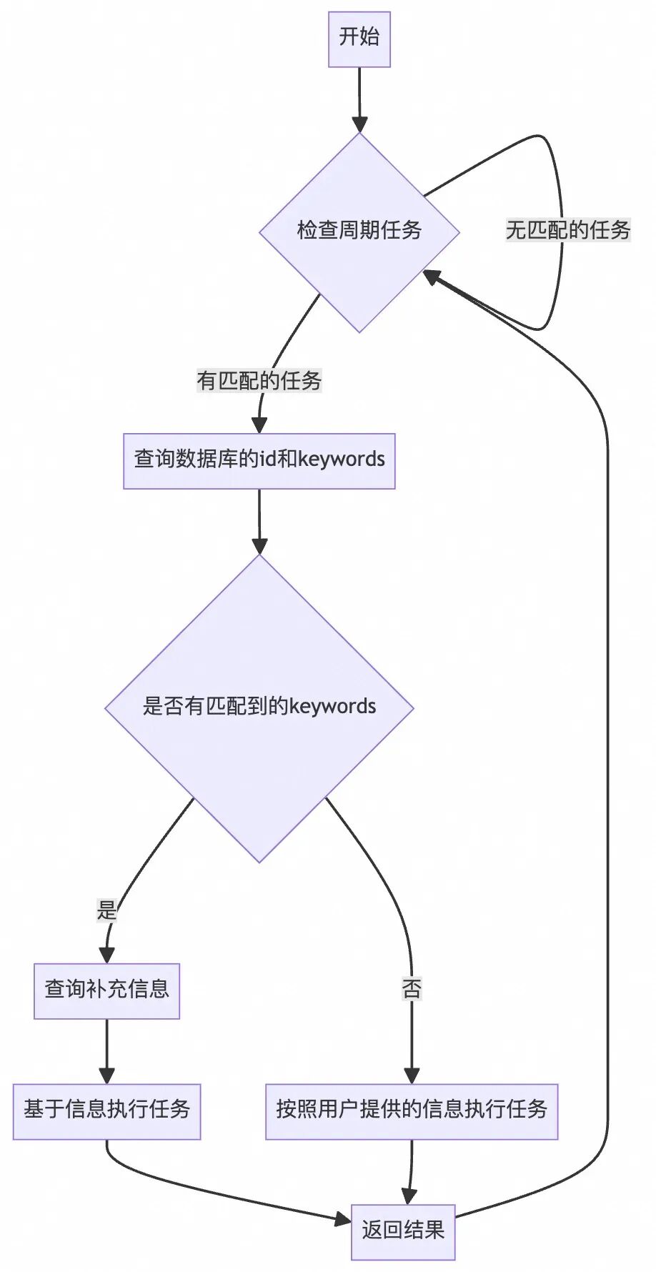 于是想到把不同场景的不同信息保存到向量数据库中,但向量数据库更适合保存非结构化文本。现在需要保存的是不同场景的元数据信息,不太适合保存到向量数据库中。于是尝试把数据保存到关系型数据库中,表结构中我设置了keywords列,用户提问后agent会先查询keywords,进行语意匹配,返回最适合的id,再查询id对应的其他信息。若没有匹配的keywords,则按照用户提供的信息进行任务,这一步其实就是RAG做的事情。流程如下。