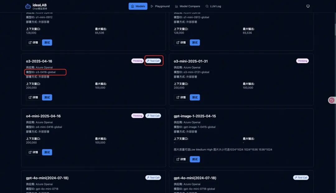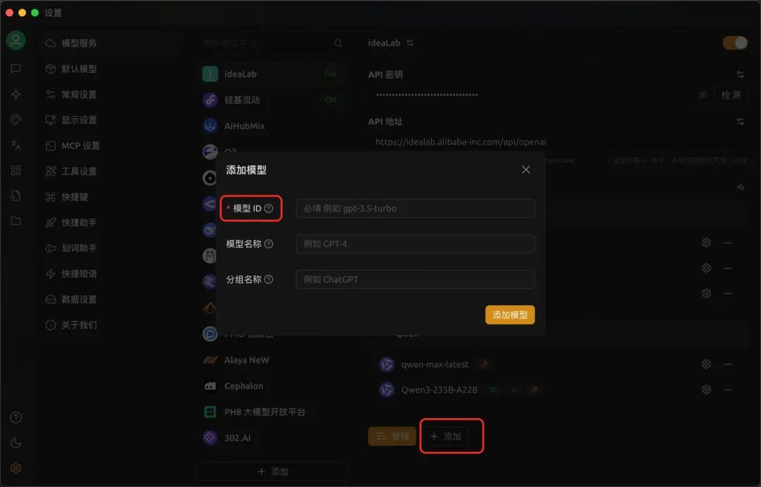 4.点击模型平台中的“添加”,这里需要填入模型ID。进入ideaLab提供的模型清单,复制模型ID,填入即可。注意,选择的模型必须要有工具调用能力。