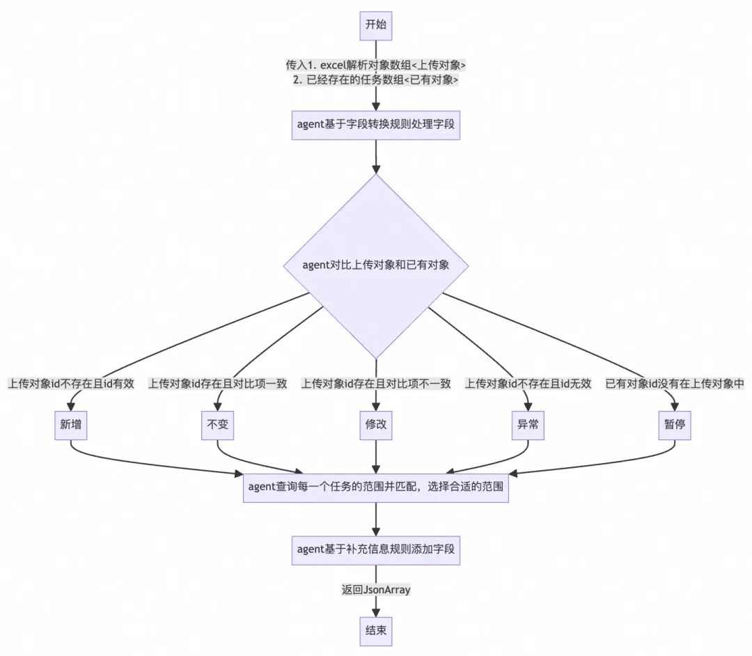 现在需要让agent处理更加复杂的场景,要对比上传的任务和已经存在的任务。agent处理流程图如下。