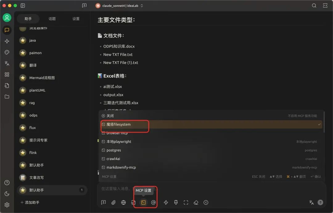 9.点击助手--MCP设置,选择刚才配置好的MCP Server。(再次强调,模型必须要有工具调用能力)