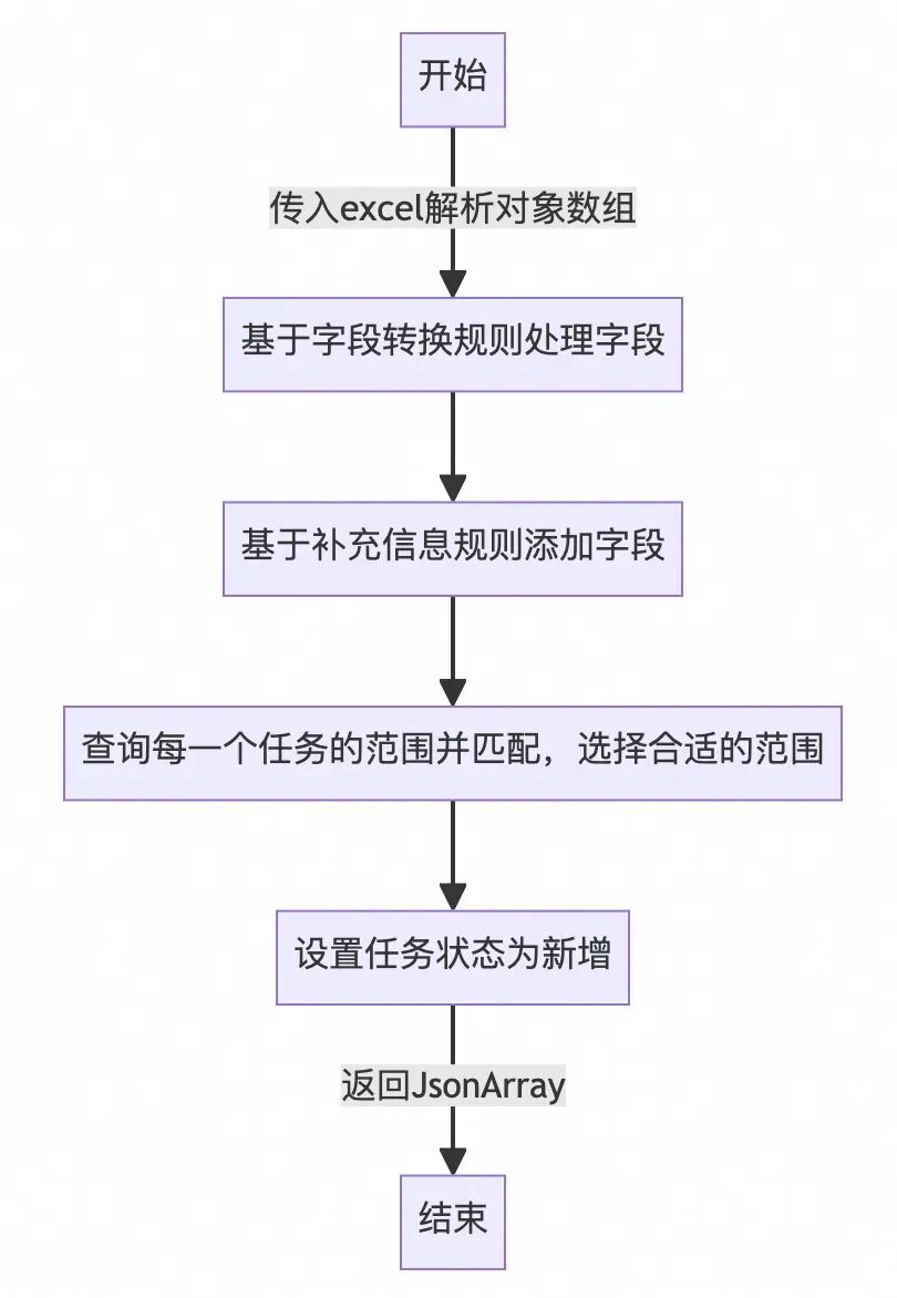首先只考虑最简单的情况,试验可行性:对于上传的所有任务,统一按照新增处理。通过工程解析excel,在ideaLab中配置agent,并在提示词中增加字段转换规则(即将excel的字段内容转换为枚举值)和补充信息规则(即给每个任务添加默认属性和默认值),agent处理流程图如下。