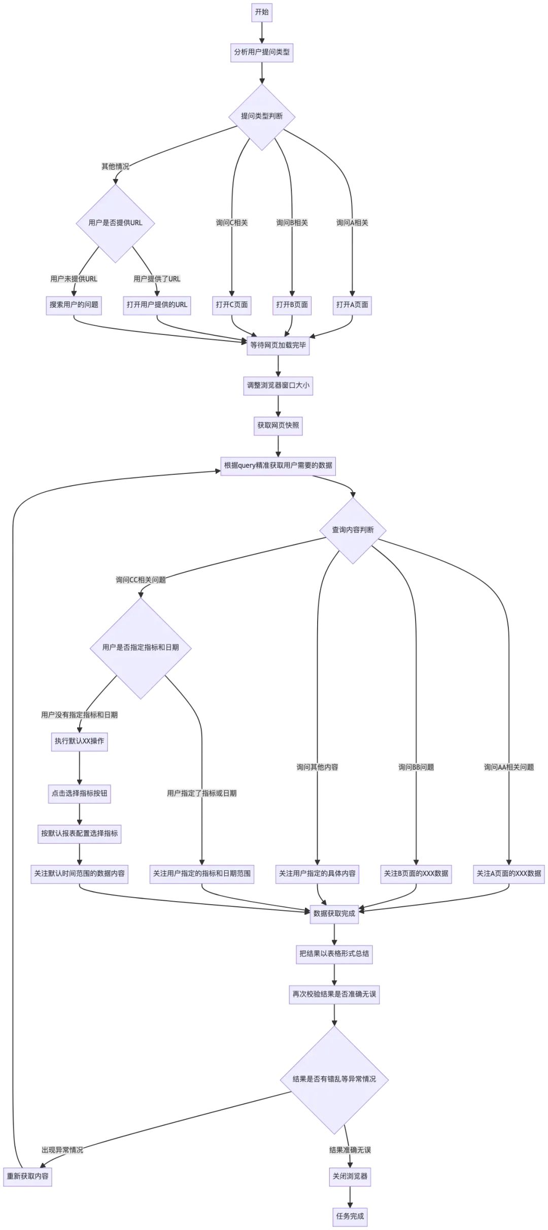 最开始构建时,我把不同的场景全部放到了系统提示词中,通过mermaid的选择节点来区分不同的场景,如下图。但随着场景的增多,会导致流程描述越来越复杂,这种方案肯定是不行的。