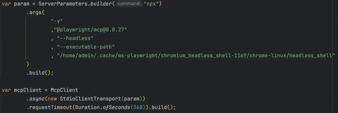 2.Java工程中需要使用Spring-Ai或Spring-Ai-Alibaba框架进行Agent开发。创建MCP Client时需确保是无头模式且要指定playwright的无头浏览器路径。