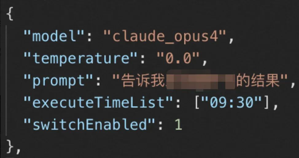 模型相关配置(选择什么模型,模型的温度)、定时时间、触发提示词。如图就是一段期望每天早上09:30执行的场景配置。
