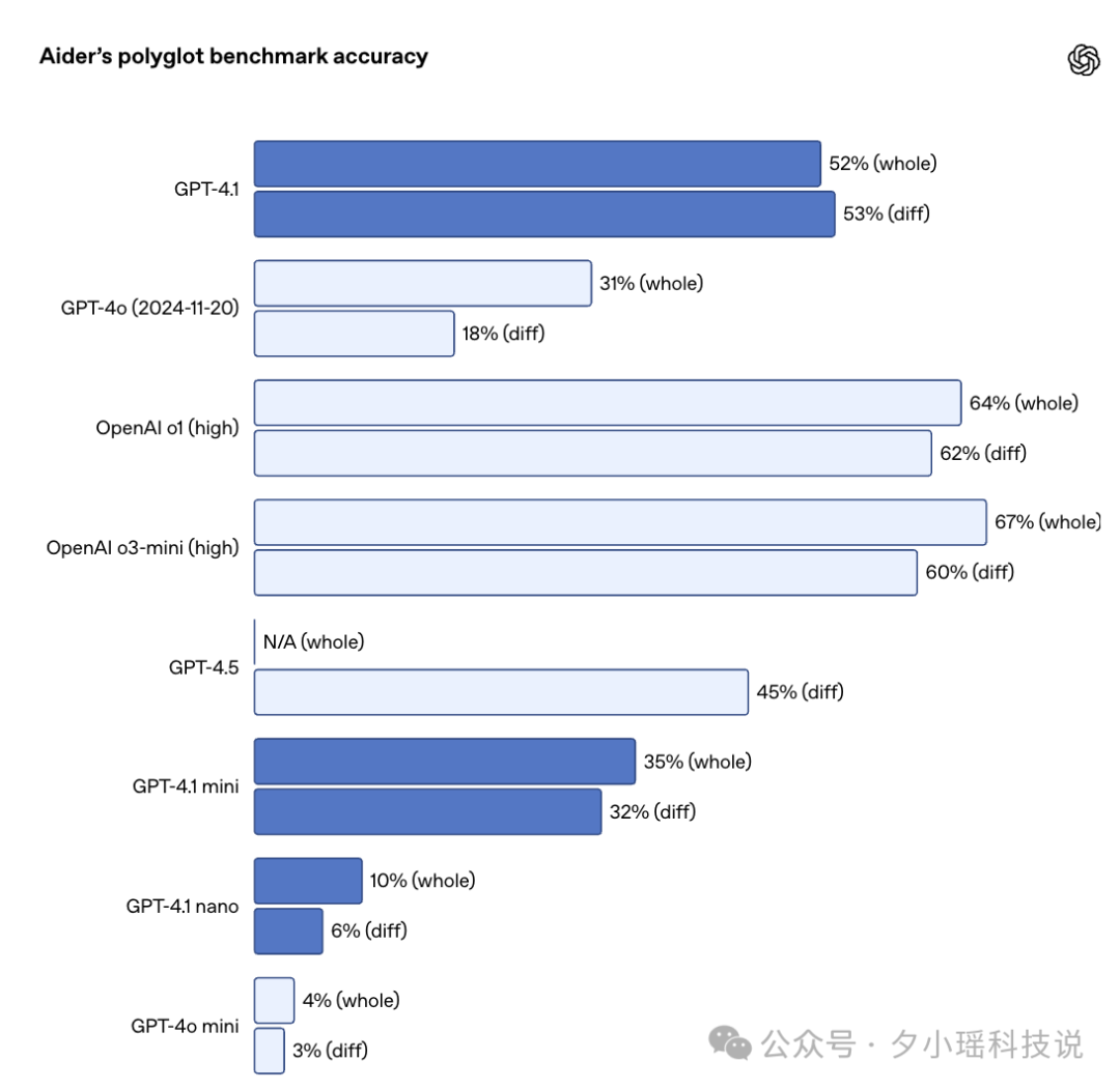 这次 GPT-4.1 特别强调了编码和长上下文能力。我们来看看它在两大编程基准测试中的表现: