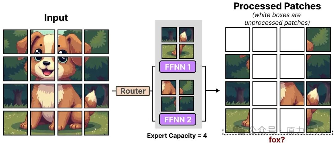 考虑到图像通常包含大量分块,为缓解硬件限制,每个专家单元都预设了较小的处理容量。但容量过低容易导致分块被丢弃(类似标记溢出问题)。