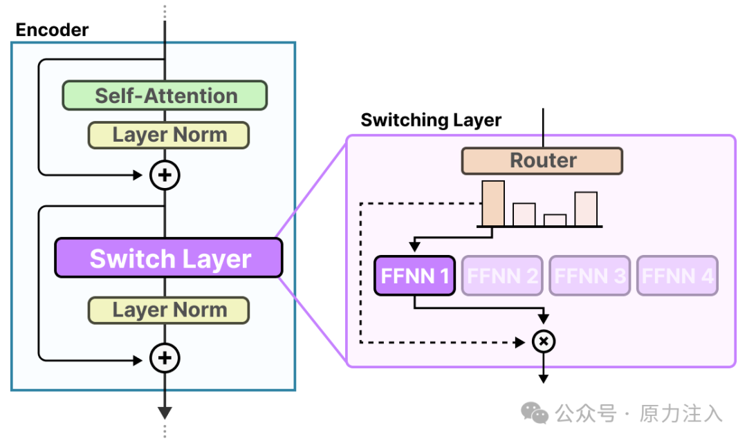 Switch Transformer是基于T5模型(编码器-解码器架构)改进的模型,通过用交换层替代传统的前馈神经网络层。该交换层采用稀疏混合专家架构(Sparse MoE),基于Top-1路由选择机制为每个文本标记分配唯一专家单元。