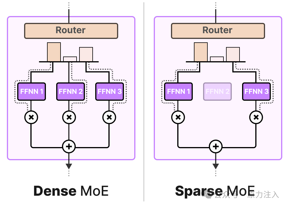 两者虽均采用路由分配机制,但稀疏混合架构仅激活少数专家单元,而密集型架构则全量调用并实施差异化权重分配。
