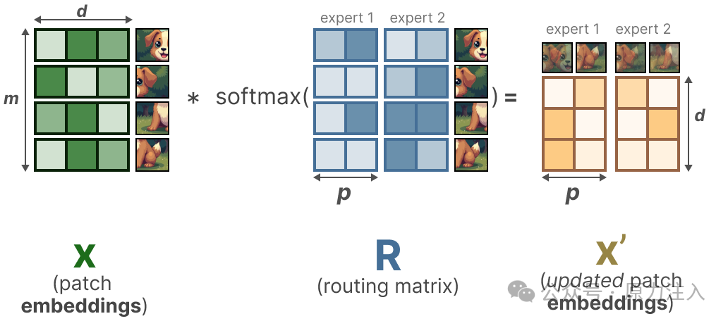 从视觉角度观察,所有图块呈现出混合交融的状态。这些整合后的图块数据将被并行传输至各专家单元进行处理。输出结果生成后,需再次与路由决策矩阵进行乘积运算。