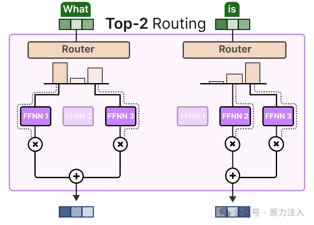 最终系统将每个路由通道的输出结果与对应专家单元的计算输出相乘,并进行聚合求和操作。