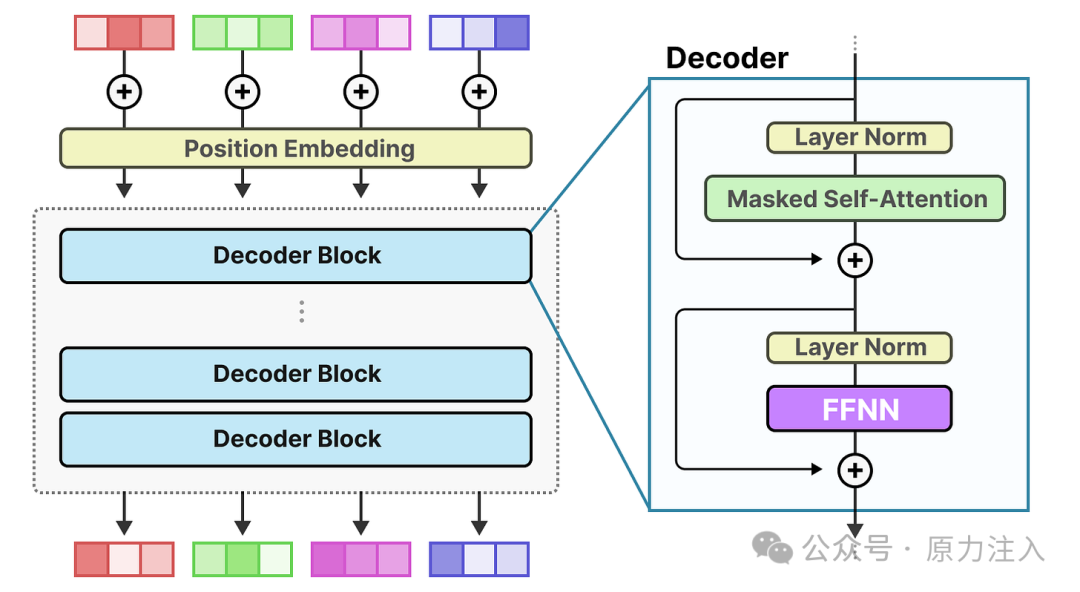 值得注意的是,在标准的仅解码器架构Transformer中,FFNN应用在层标准化处理之后: