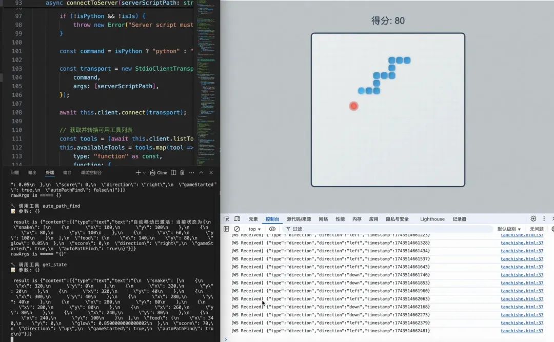 通过 MCP Server,成功与贪吃蛇客户端建立连接,并实现基础控制,接下来,就让 AI 来玩贪吃蛇吧。