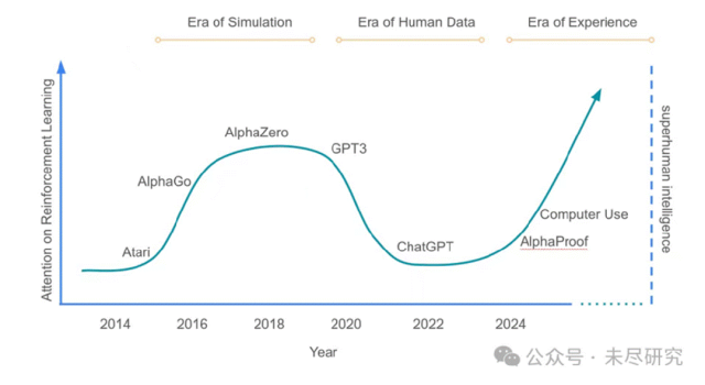 这篇由谷歌DeepMind负责强化学习的副总裁西尔弗(Daivd Silver)和今年图灵奖获得者、强化学习奠基人萨顿(Richard Sutton)共同撰写的论文《欢迎来到经验时代》,把大模型分成了三个阶段,模拟的阶段,人类数据阶段,实验数据的阶段。它的一个核心观点,就是说我们现在研究大模型,不仅仅是在预训练阶段撞上了数据墙,而且整个AI的研究都撞上了数据墙。我们现在用的有质量的人类数据,已经基本上耗尽了,更多真正高质量的数据的来源,是在人类的边界之外。AI在进入经验时代,即agent不断地从与环境互动的经验中学习。