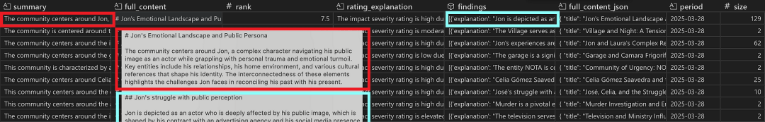 社区表的快照,包括LLM生成的报告(full_content列)和报告摘要(summary列)。报告文本是摘要(红色)和发现(蓝色)的组合。rank和rating_explanation列包含LLM分配的重要程度值(1到10之间)以及选择该值的说明。