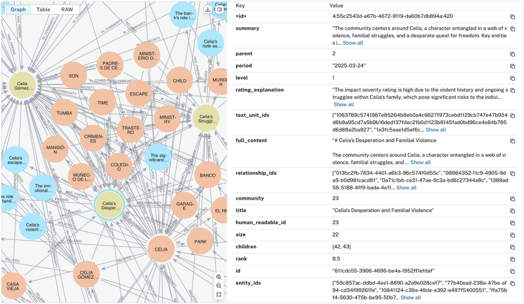 社区表快照。社区 0 是一个级别 0 的社区,因此它是一个根社区(没有父社区)。它有两个子社区,如子节点列所示。所有关系、文本单元和实体都被社区所包含,分别列在相应的列中。大小列显示该社区由 131 个实体组成。