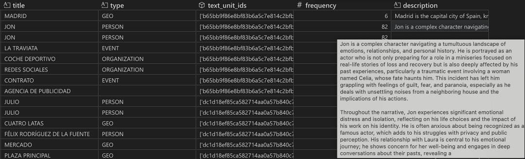 实体表的快照。实体按实体标题和类型进行分组。实体 Jon 被提取了82次,这可以从频率列中观察到。text_unit_ids 和 description 列分别包含82个ID和描述,分别显示 Jon 在哪些片段中被识别和描述。默认情况下,有四种实体类型(Geo、Person、Event 和 Organization)。