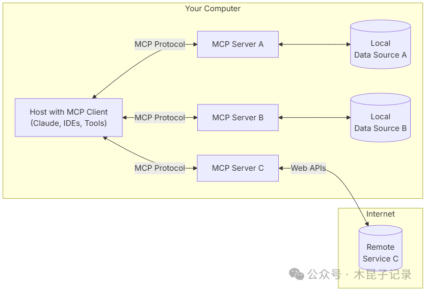 搞清楚ReAct框架和Function Call的关系以后,我们再看看MCP(Model Context Protocol)大模型上下文协议,去年Anthropic推出的MCP概念,今年以来热度持续上升,尤其是OpenAI也宣布支持MCP以后,似乎一页之间万能手、通用agent等概念都有了落脚点。官网对MCP架构的介绍可以参考这个链接,主要架构图如下(https://modelcontextprotocol.io/introduction):