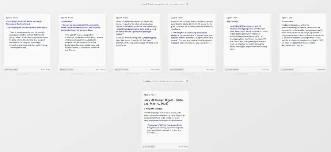 这些平行的块就是搜索过程,它们最终会汇总成一个完整的文本版日报。
