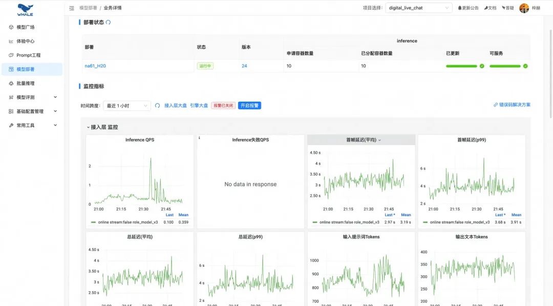 调用的方式: -H"Content-Type:application/json"-H'X-AK:xxxx'-d'{"model":"gpt-3.5-turbo","prompt":"你是谁"}'2.1.2. 部署在whale上的开源模型whale平台上提供了丰富的开源模型部署,根据调试或批量调用的需求,可以分成访问免费部署模型和独立部署模型两部分。整体体验还是比较便捷,对大模型部署支持的比较好,比较推荐。