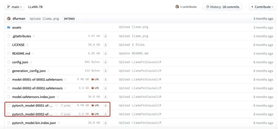 1.1.4. 模型存储我们以 LLaMA-7B 为例,这个大模型参数量约为 70 亿,假设每个参数都是一个 fp32,即 4 个字节,总字节就是 280 亿字节,则 280 亿字节/1024(KB)/1024(MB)/1024(GB) = 26.7GB,当然这是原始的理论值,我们再往下看。因为实际存储 weight 权重参数会存 fp16,所以模型大小继续减半为 13.35GB。但是部分 layer norm 等数据会保留源格式 fp32,因此实际会稍微有所增加到 13.5GB 左右,我们从开源的 LLaMA-7B 的实际的存储结果来看,是符合上面的计算的: