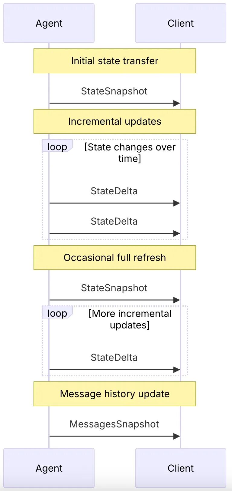提供完整快照STATE_SNAPSHOT与增量更新STATE_DELTA,高效同步状态