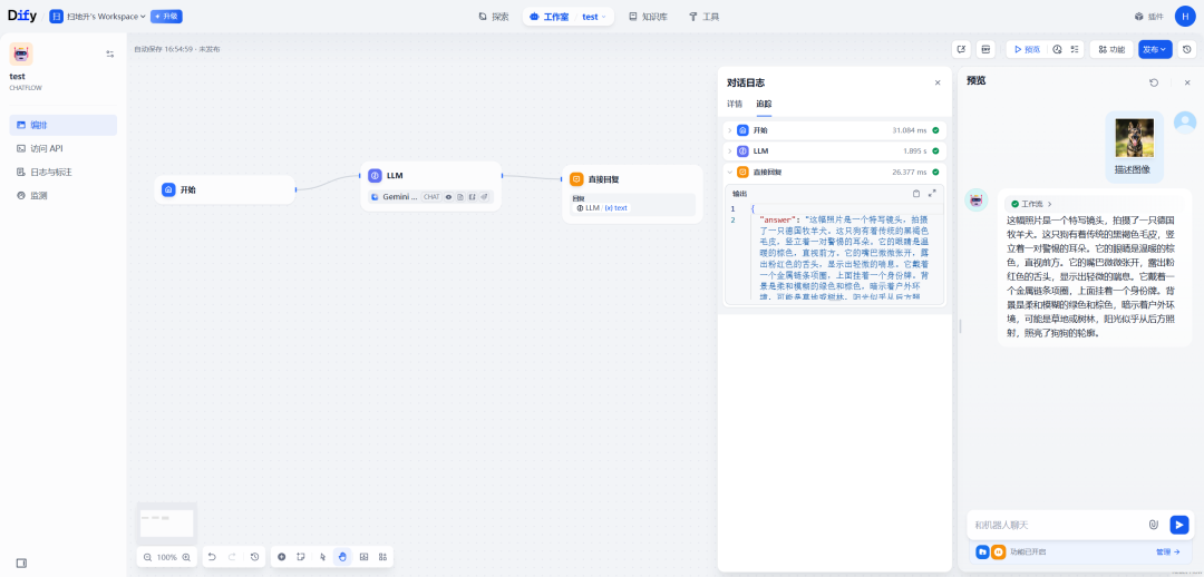 • 当工作流执行到LLM节点时,系统提取用户配置的提示和上传的图像