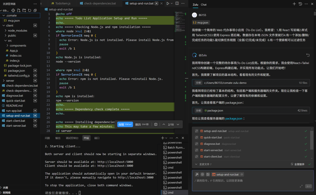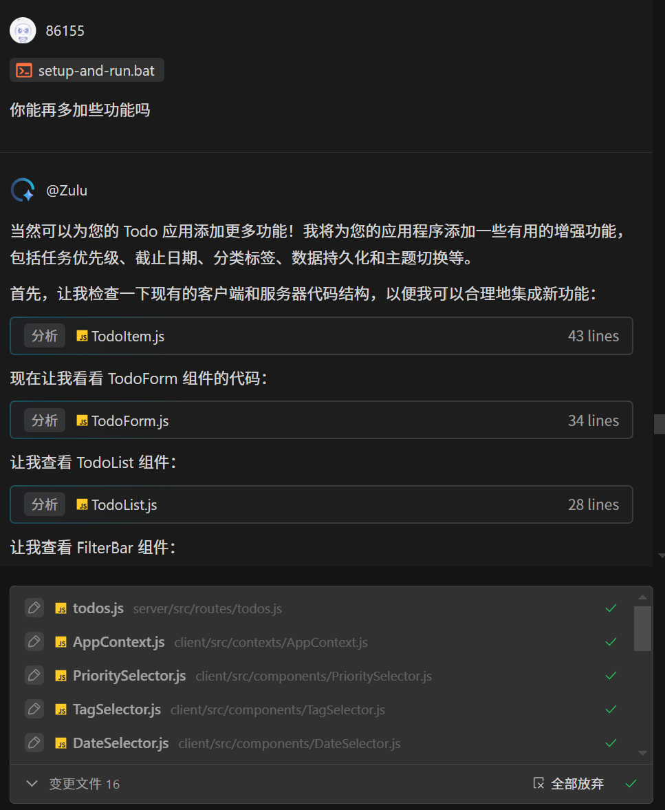 这基本算得上一个小项目的构建请求了。换做平时,我们起码得先拉个项目结构、装一堆依赖、调前后端接口,再一点一点补功能,但在 Zulu 这边,它理解完需求之后,直接开始组队上活:前端建组件、后端写接口、路由和状态管理都一步步同步推进。
