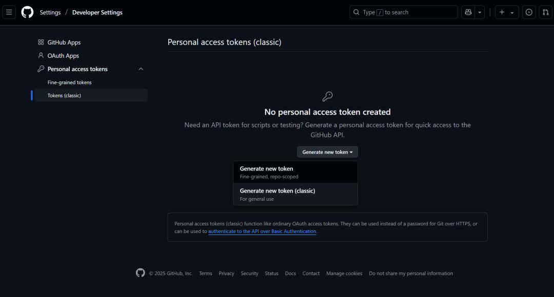 打开 github 官网,点击右上角的头像,点开 Settings,鼠标划到最后左边栏找到 Developer settings,再找到 Personal access tokens 点击 Tokens (classic)。