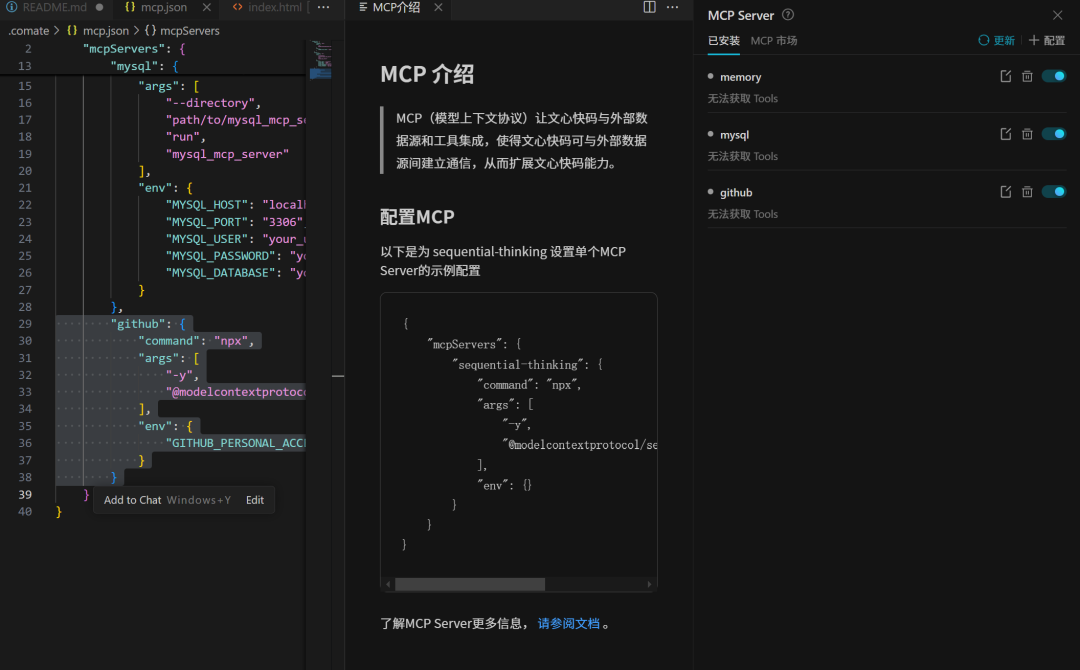 Comate AI IDE 的「MCP 市场」 已经集成了好多工具,比如 GitHub MCP、Figma MCP 等等;