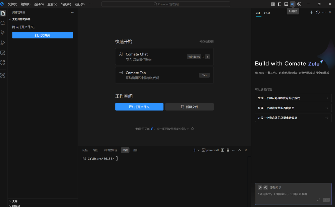 装好 Comate IDE 后,首页界面右侧有个“AI 面板”,它有两个模式:Zulu 模式和 Chat 模式。